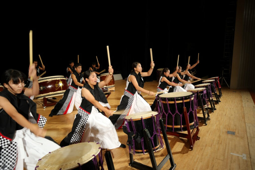 Cet ensemble d’adolescents et de jeunes étudiants, fondé en 2003, nous présente ses « daikos » (tambours japonais), le  « taiko » (art de jouer du tambour, … dès l’âge de 6 ans) reflétant, depuis plus de 2.000 ans, les traditions magiques et  majestueuses du Japon, notamment dans les sanctuaires shintos et les temples bouddhistes, démontrant son étroite association à la religion . Si les anciens sentaient la puissance de la divinité dans le son grondant du taiko, celui-ci a joué un rôle important pour accompagner, dès la féodalité, les réputés théâtres « Kabuki »« Noh ». Pour en revenir à cet ensemble, soulignons qu’il s’est produit, en 2019, à Tokyo, à l’occasion du match d’ouverture de la « Coupe du Monde de Rugby à XV », ainsi, que pour la « Ligue japonaise de Base Ball ».